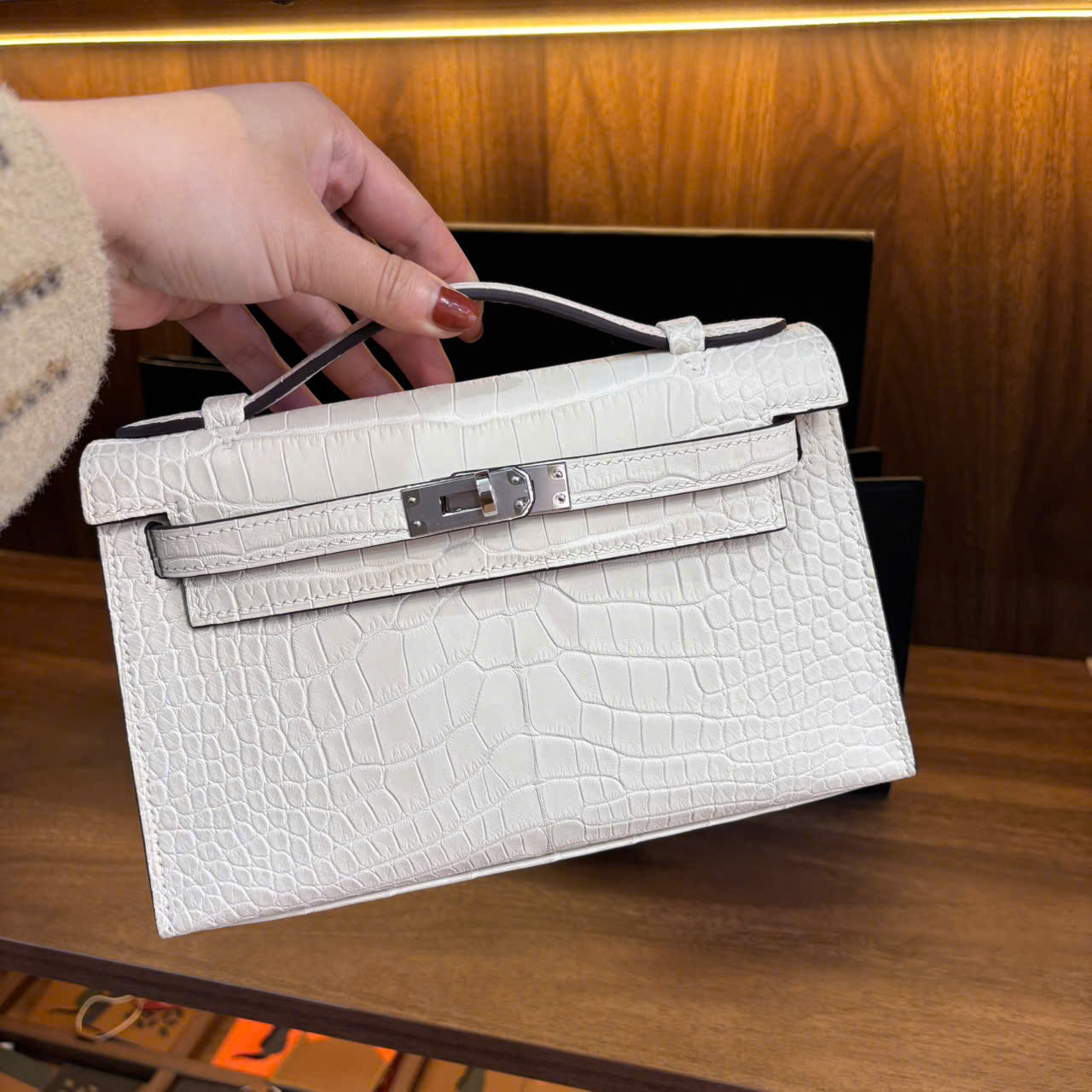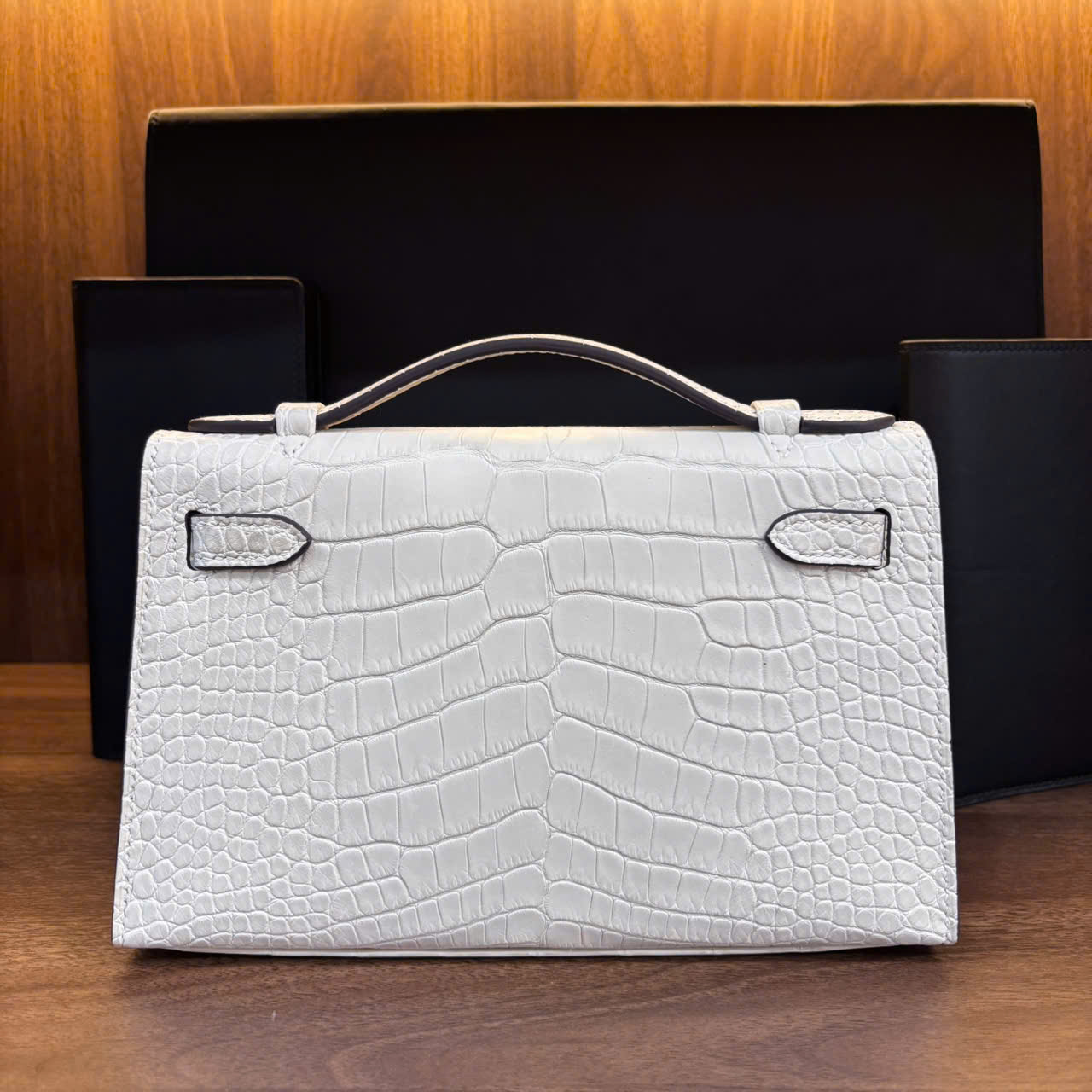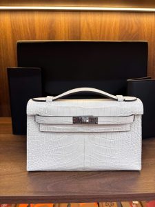 ✨ Vẻ đẹp từ sự nguyên bản: Không cần những logo phô trương, chính cấu trúc hình khối vững chãi cùng nắp khóa cài tinh xảo đã tự nói lên đẳng cấp của chủ nhân. Sắc trắng sữa trên nền da cá sấu với những đường vân tự nhiên, độc bản, tạo nên một hiệu ứng thị giác mềm mại nhưng đầy chiều sâu.